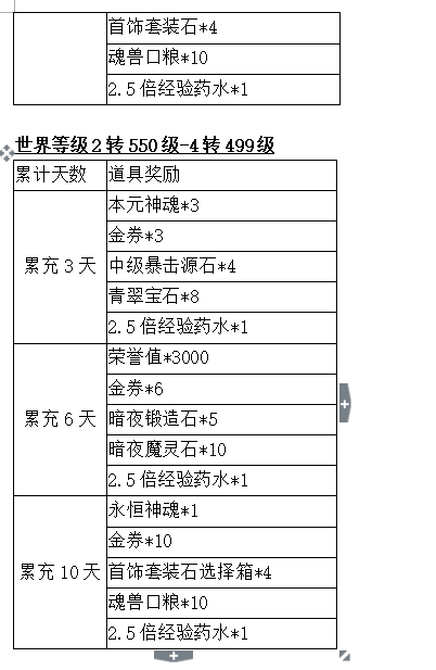 玩家等级1转400~2转599:荣誉*400、圣耀锻造石*1、宝石精粹*3、高级暴击源石*1