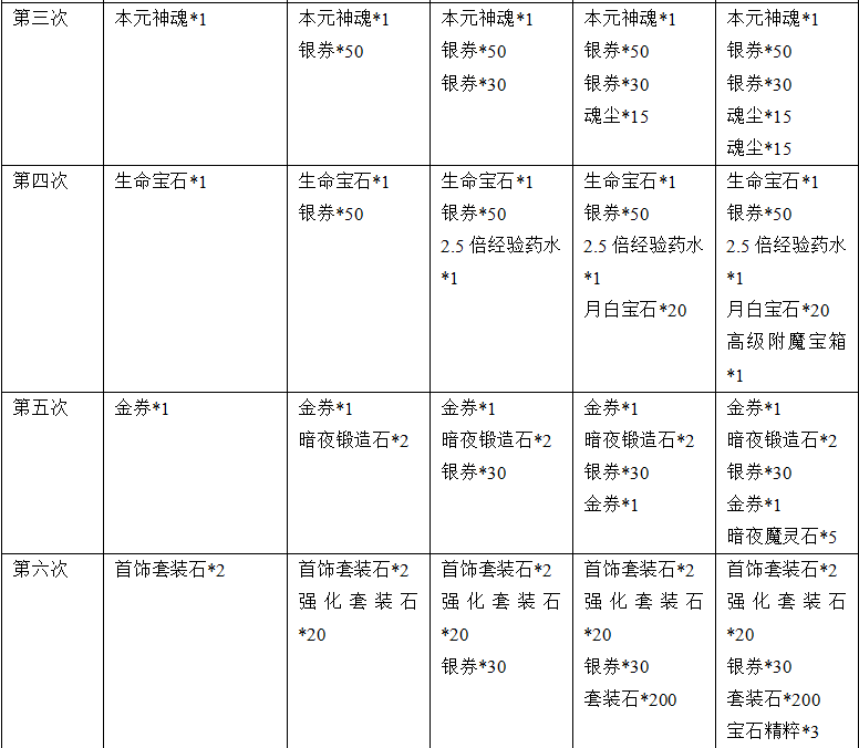 玩家等级2转600及以上:祝福宝石*30、灵魂宝石*20、神印精华宝箱*1、暗夜锻造石*1
